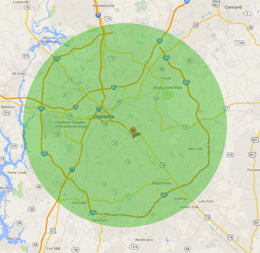 We service the greater Charlotte area as well as some other surrounding areas. Below is a map of the areas that we cover. If you live outside this area, please send us an email and we may be able to help you!
